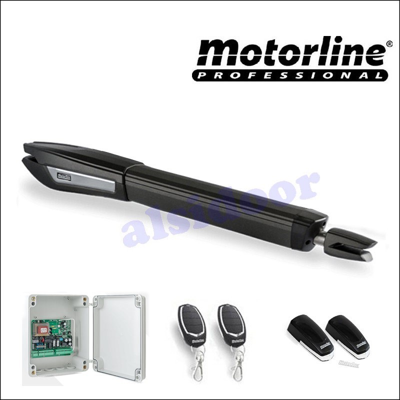 Kit Motorline PERSA 230V 2 Hojas, para puerta hasta 6m. Compuesto por dos motores batiente PERSA, una central electrónica MC2 Motorline, 2 mandos a distancia FALK Motorline y una fotocelula MF30 Motorline emisor-receptor.